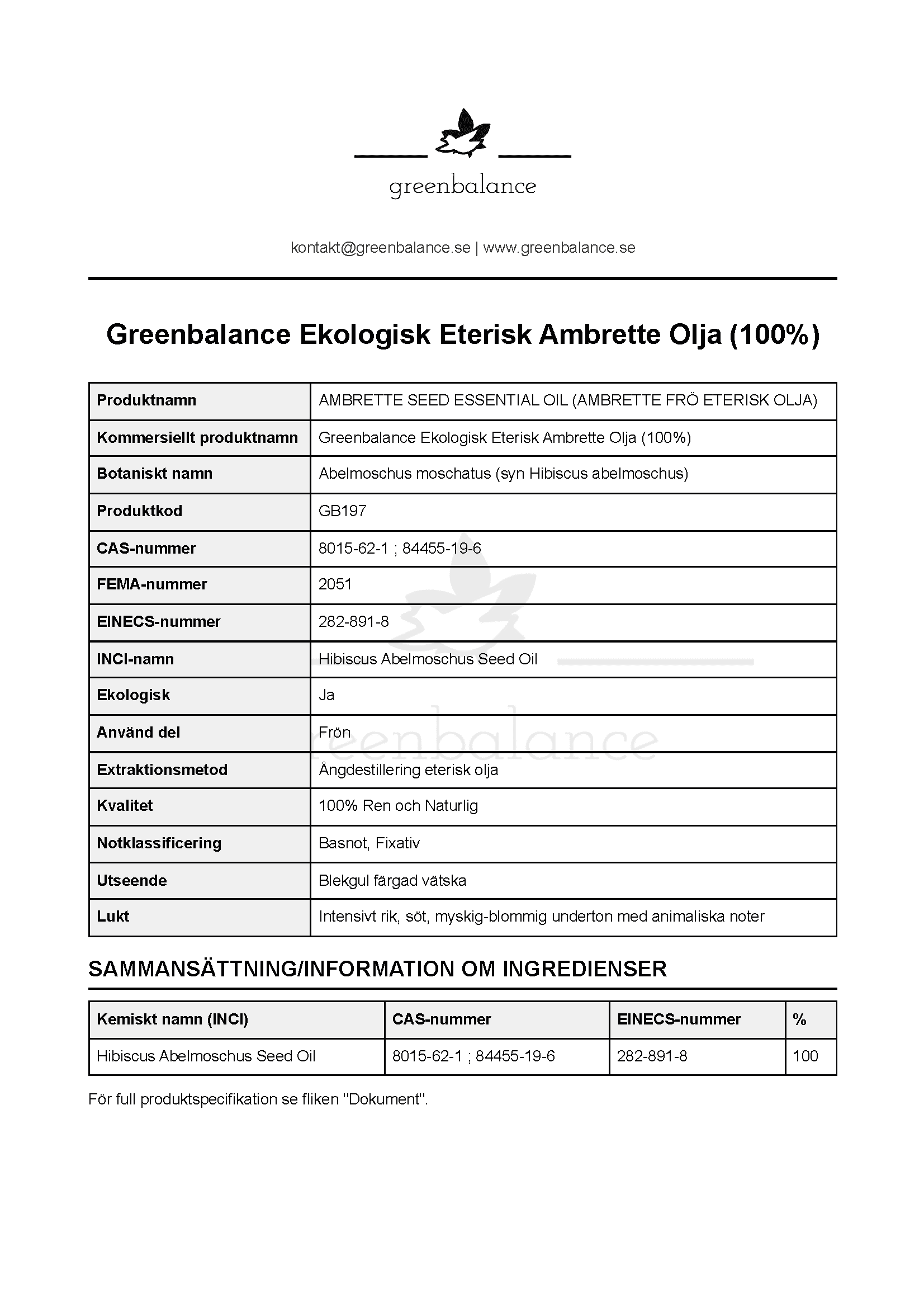 | Innehållsdeklaration | 100% Hibiscus Abelmoschus Seed Oil |