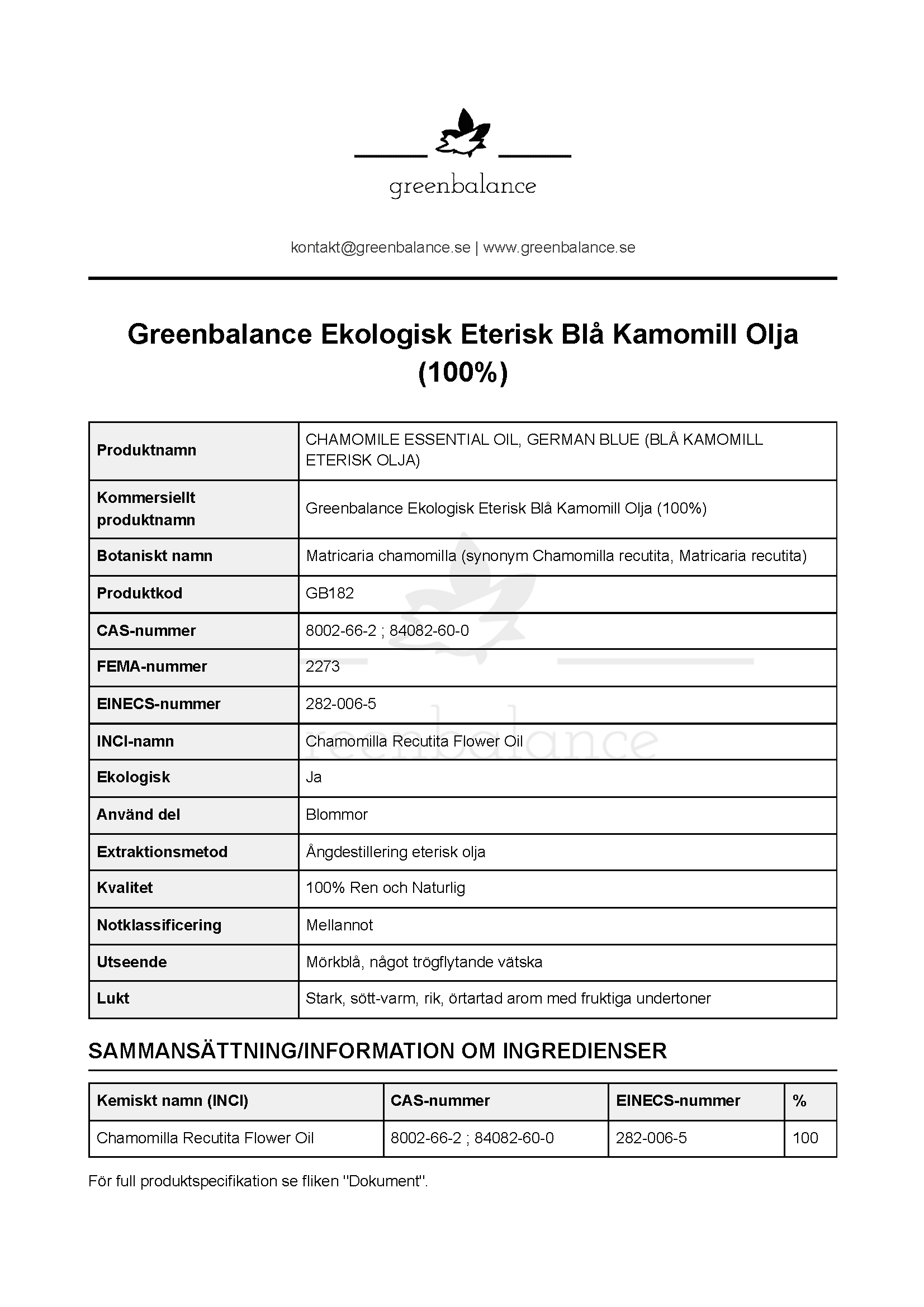 | Innehållsdeklaration | 100% Chamomilla Recutita Flower Oil |