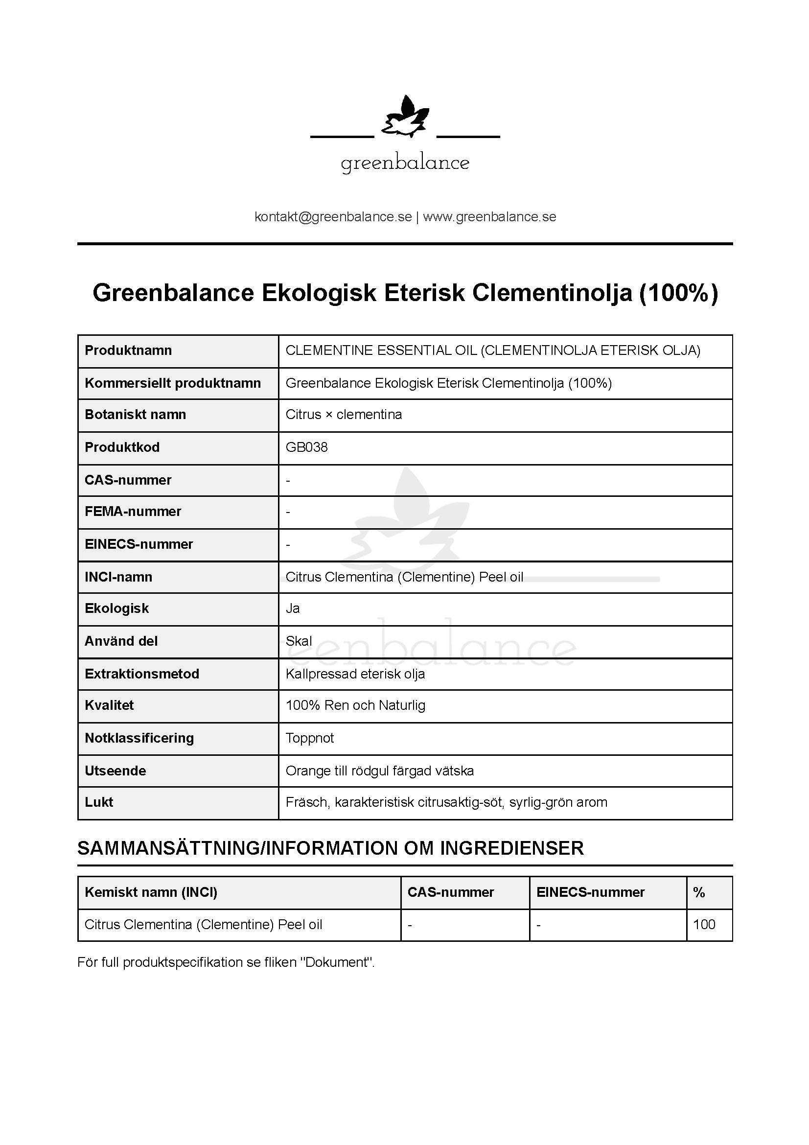 | Innehållsdeklaration | 100% Citrus Clementina (Clementine) Peel Oil |