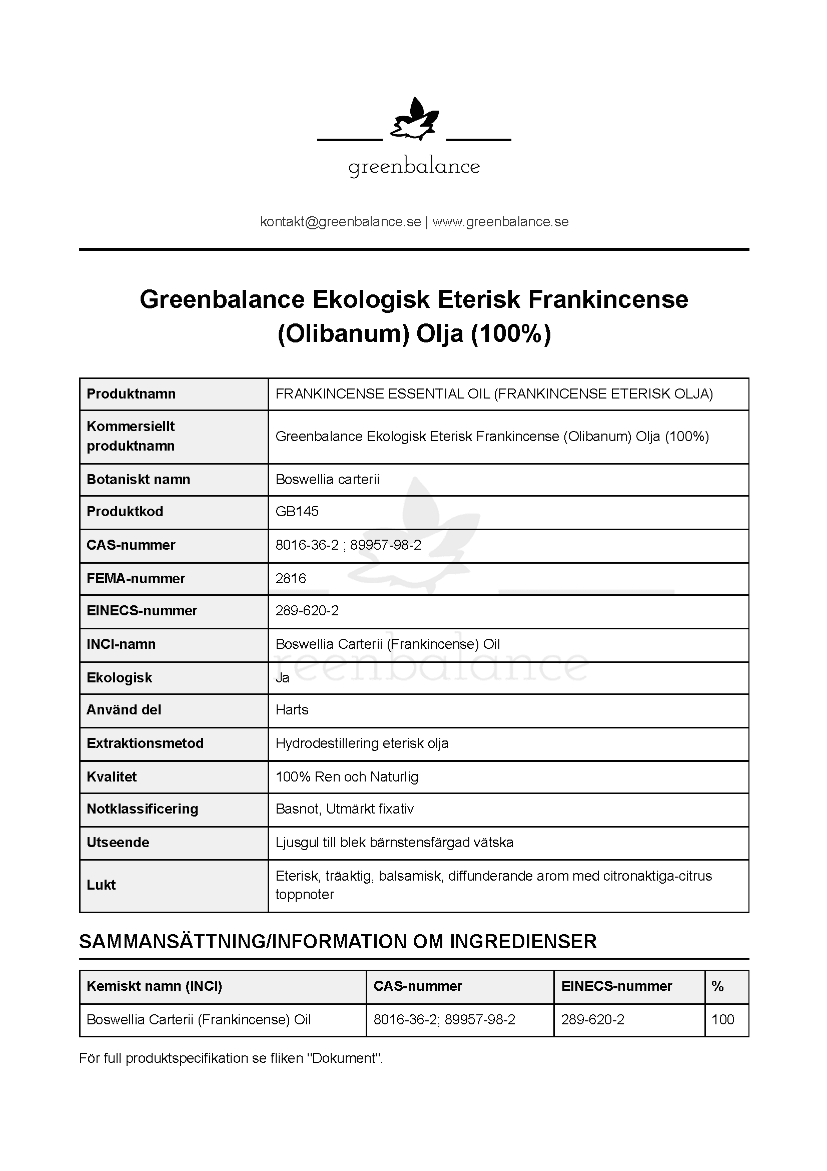 | INCI-Namn | Boswellia Carterii (Frankincense) Oil |