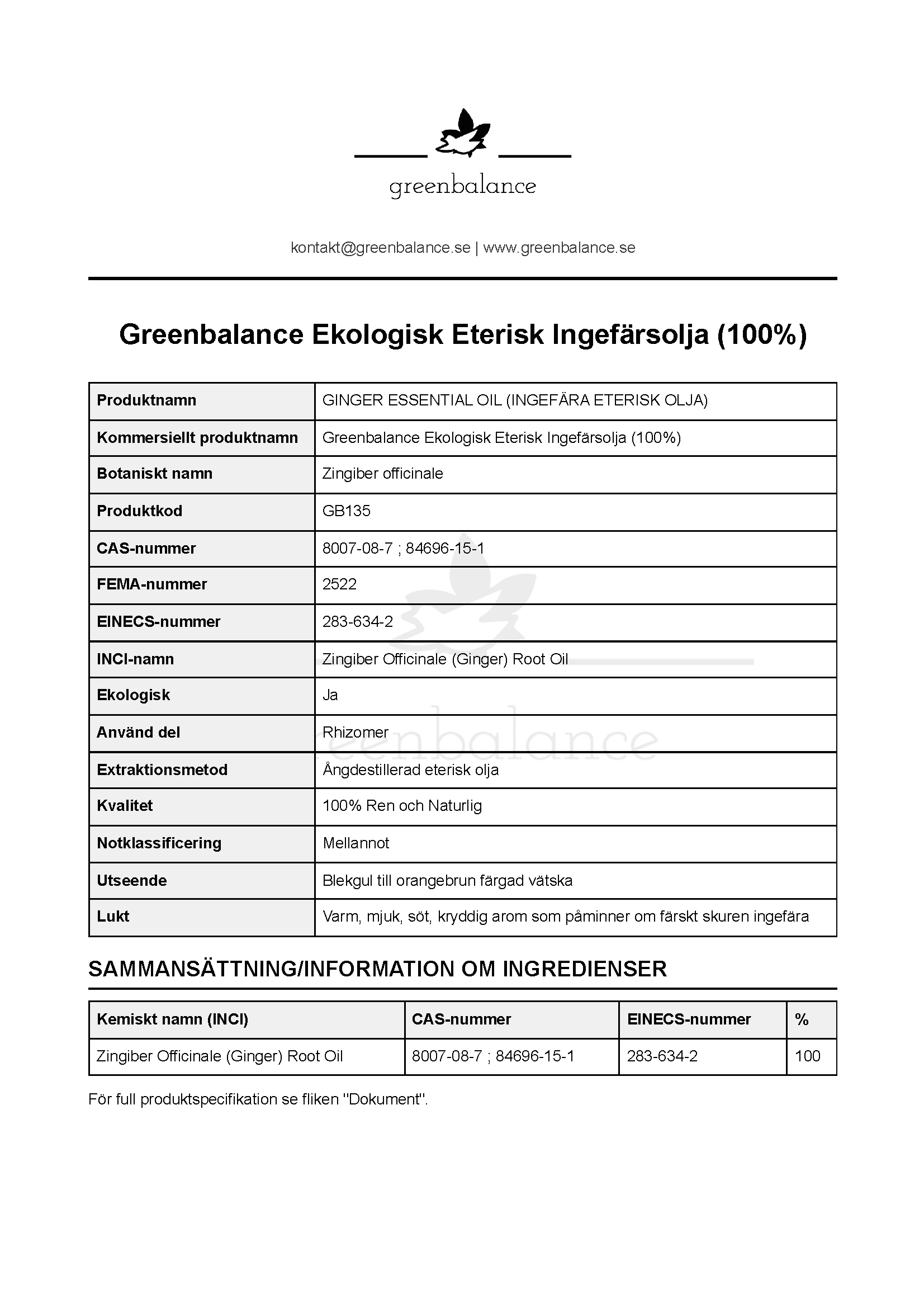 | Innehållsdeklaration | 100% Zingiber Officinale (Ginger) Root Oil |