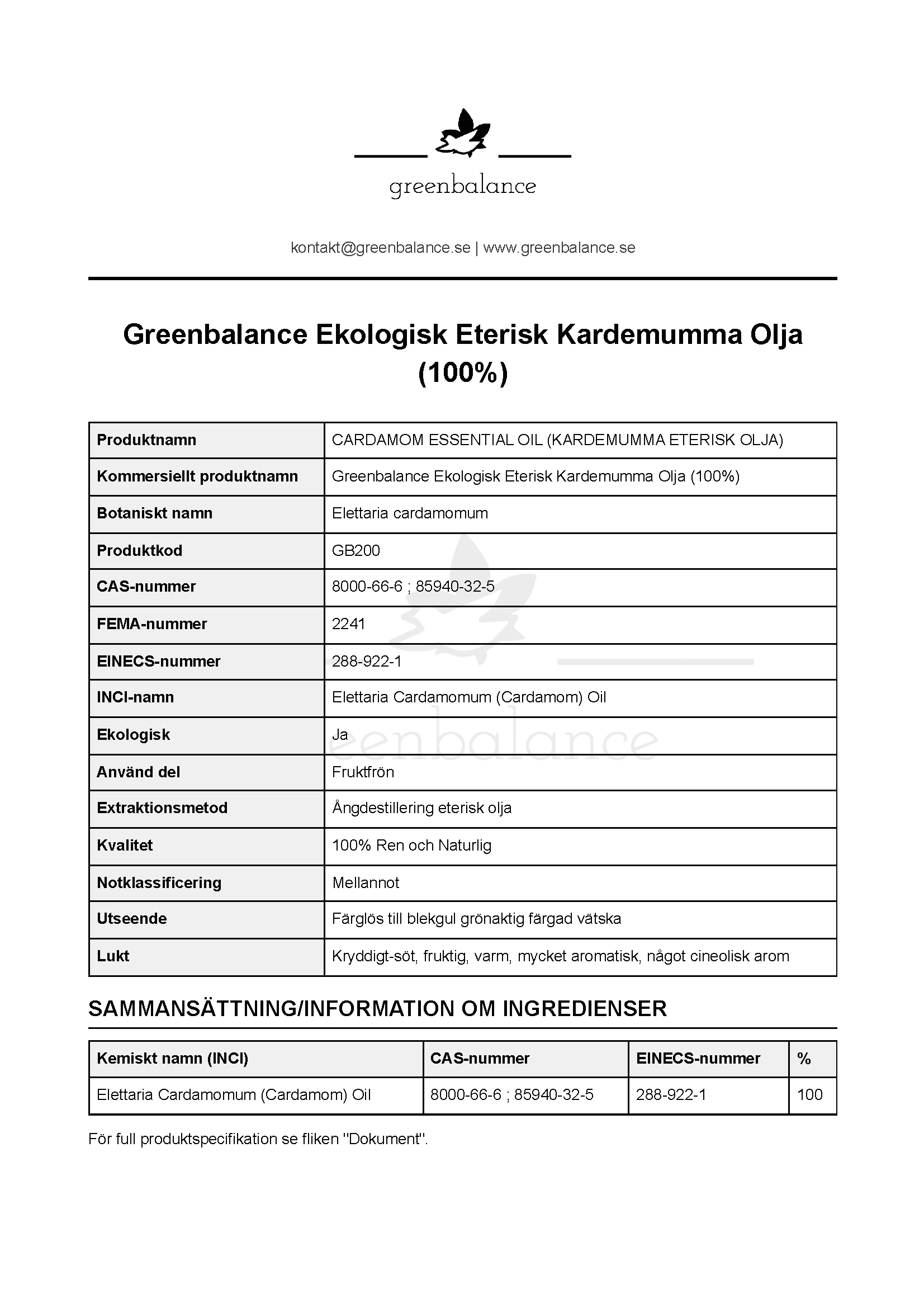 | Innehållsdeklaration | 100% Elettaria Cardamomum (Cardamom) Oil |