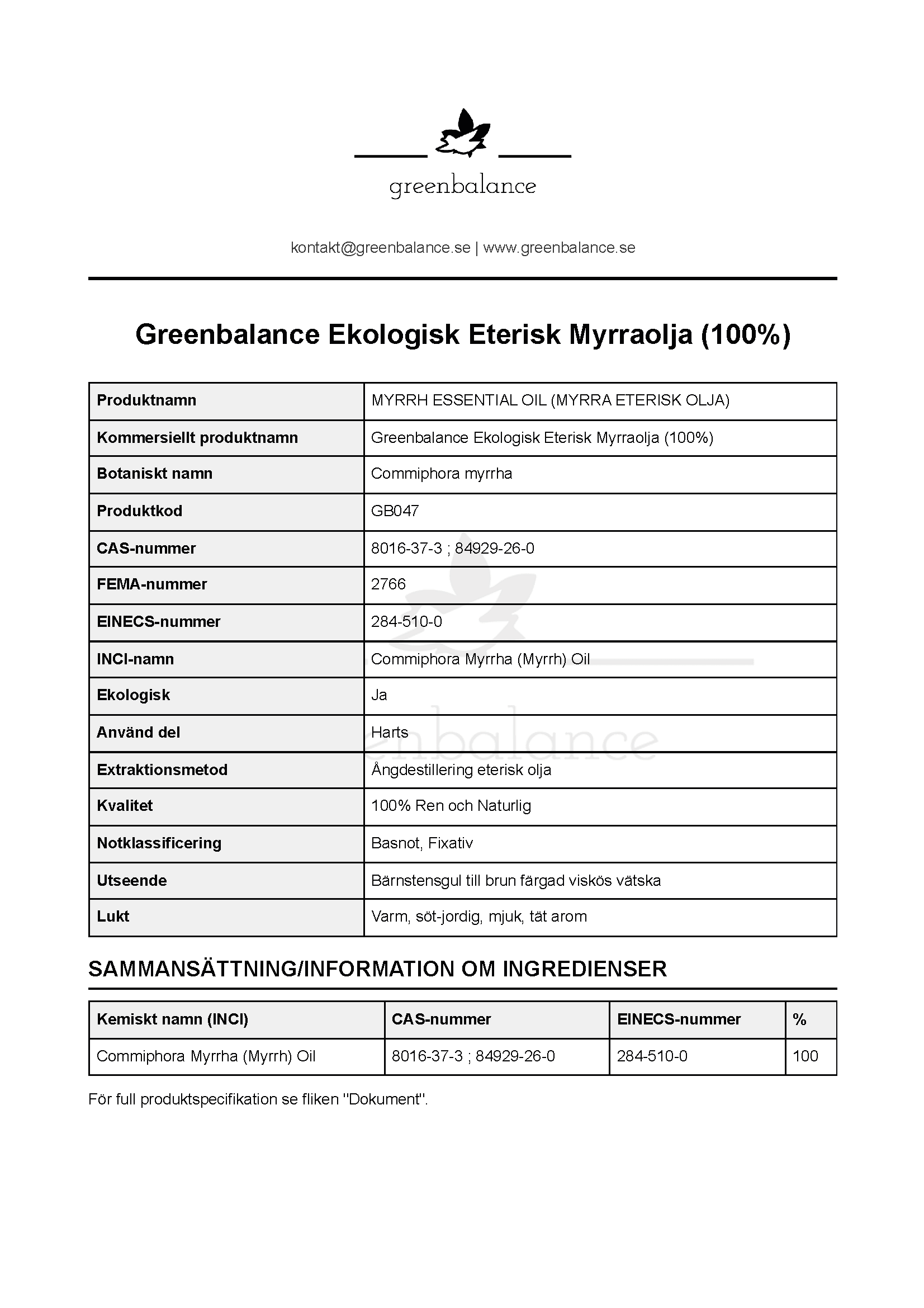 | Innehållsdeklaration | 100% Commiphora Myrrha (Myrrh) Oil |
