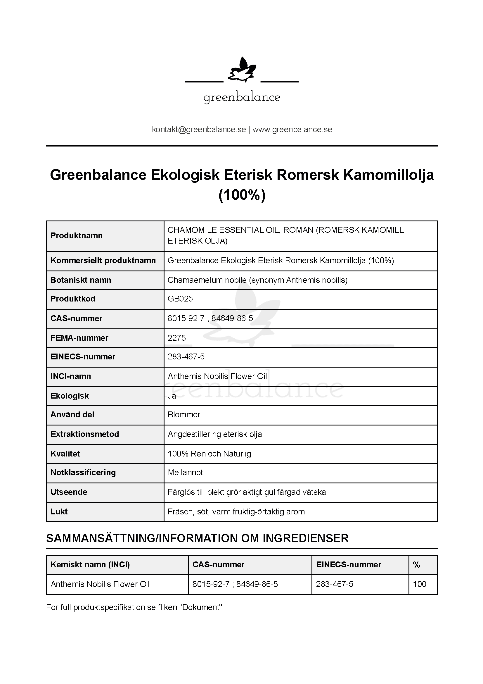 | Innehållsdeklaration | 100% Anthemis Nobilis Flower Oil |