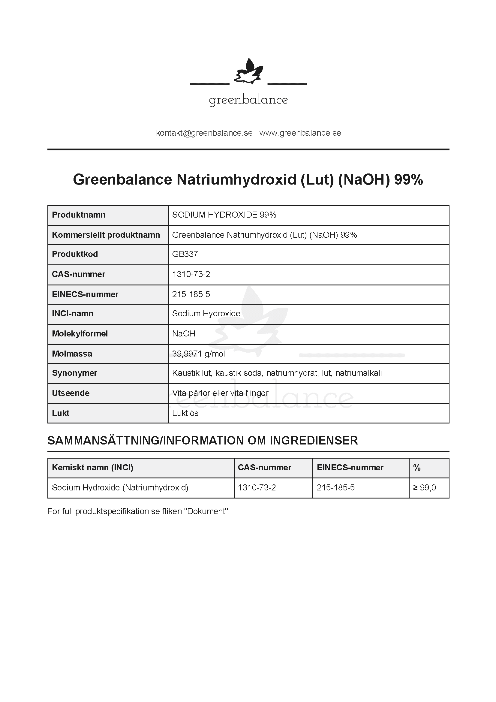 | Kvalitet | >99,0 % NaOH (faktisk analys: 99,6 %) |