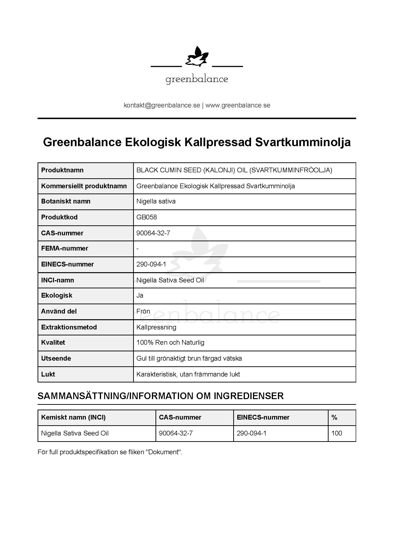 | Innehållsdeklaration | 100% Nigella Sativa (Black Cumin) Seed Oil |