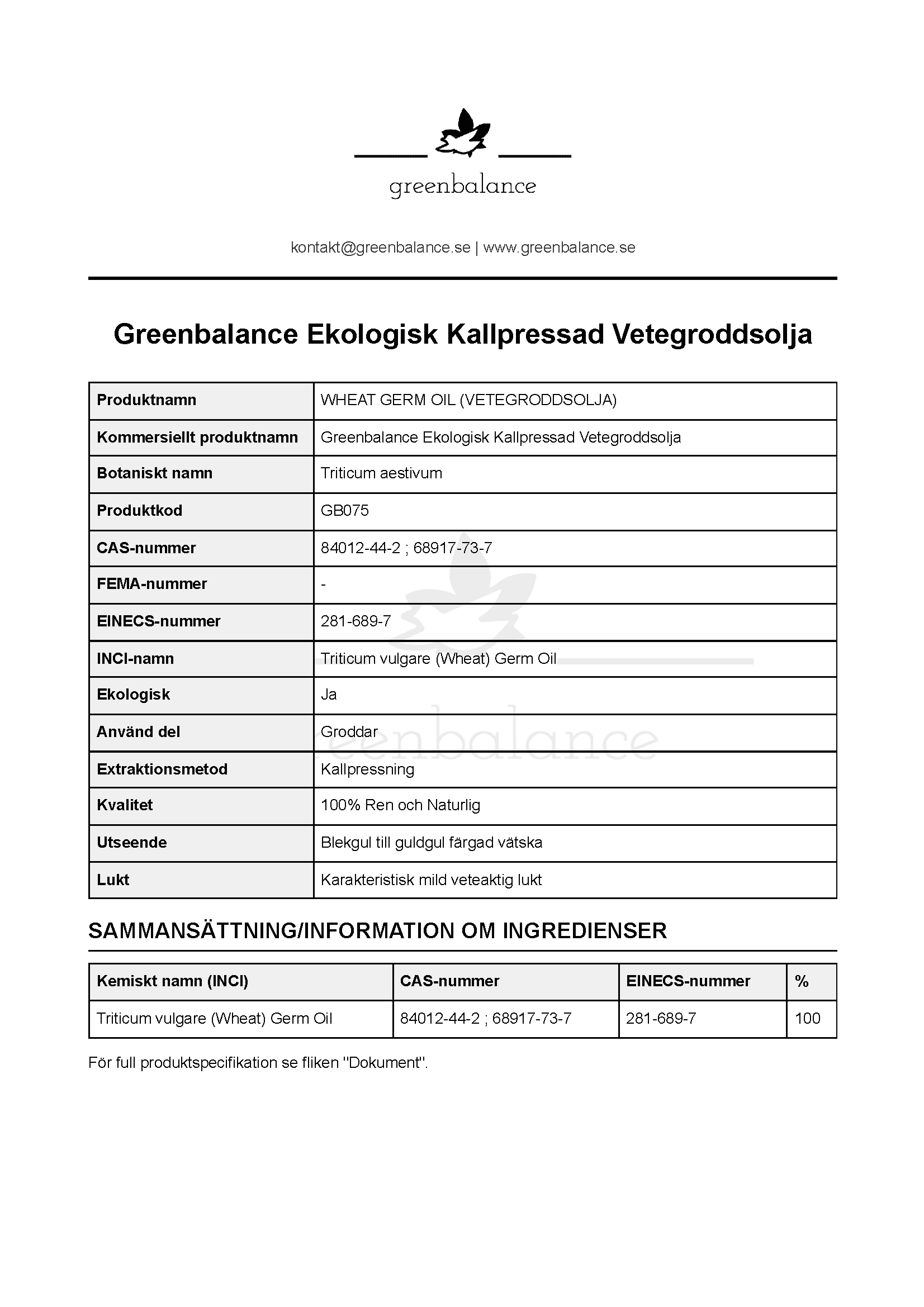 | INCI-Namn | Triticum Vulgare (Wheat) Germ Oil |